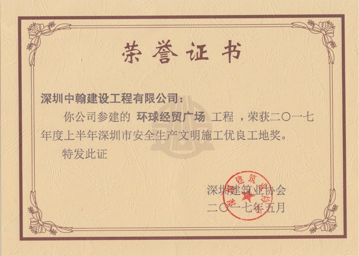 2017年度上半年深圳市安全生产文明施工优良工地奖